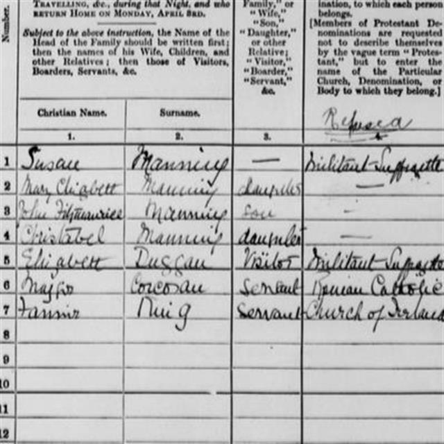 Here, in the 1911 census, Susan Manning listed her Religion as Militant Suffragette.